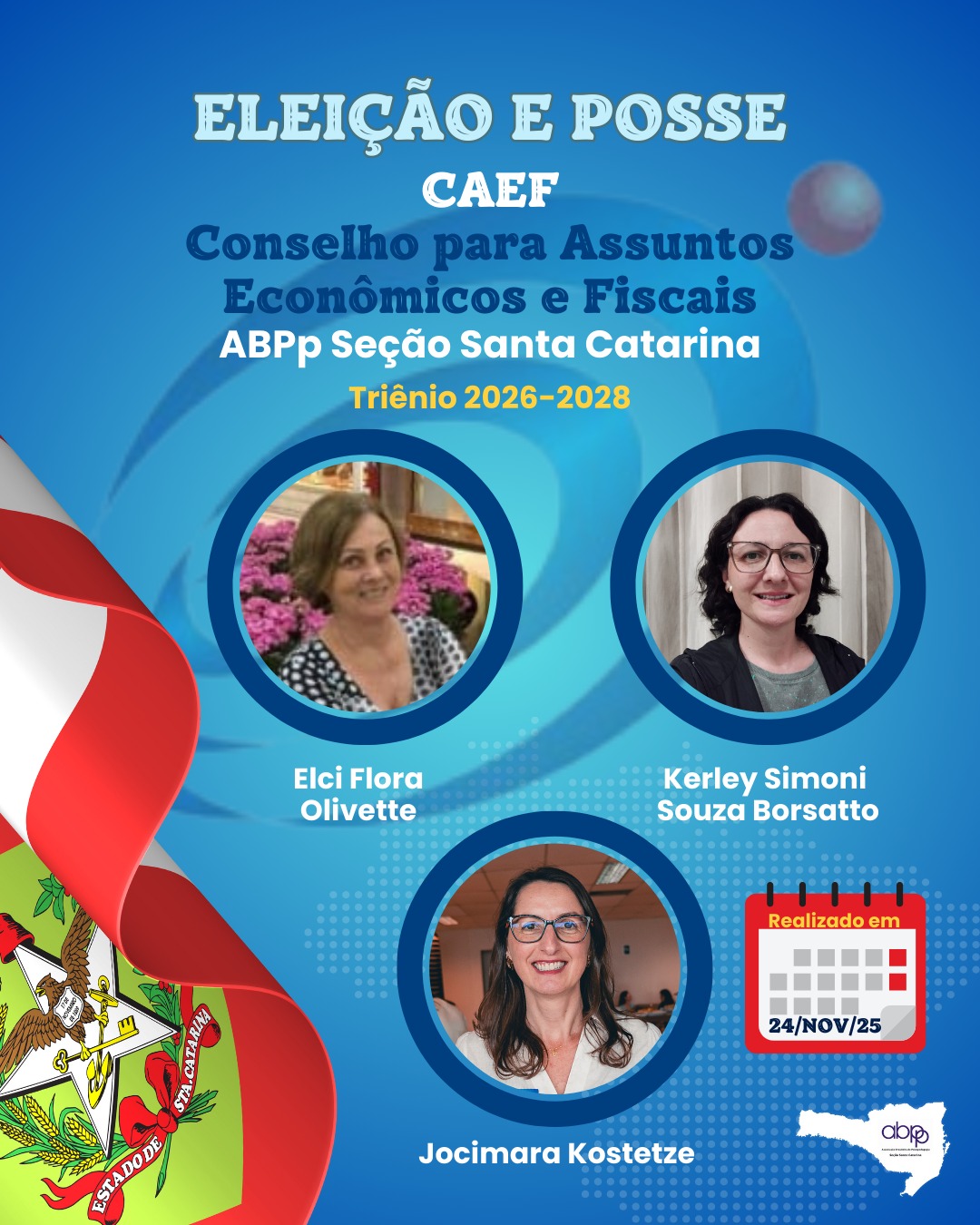 Na noite de ontem, 24 de novembro de 2025, durante a eleição e posse online da ABPpSC, foram escolhidas as novas integrantes do Conselho para Assuntos Econômicos e Fiscais (CAEF) para o triênio 2026–2028.